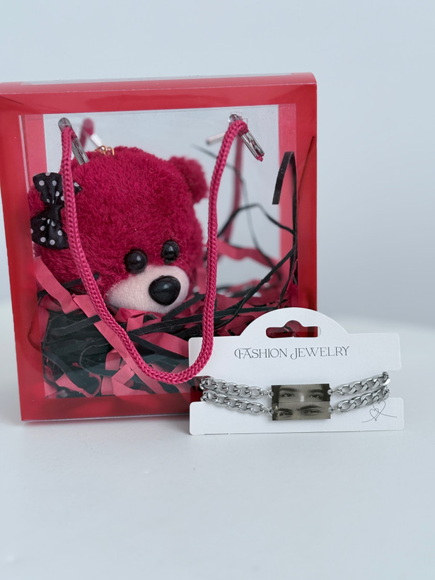 پک ولنتاین شماره یک:شامل باکس طلقی پینترسی با پوشال قرمز ومشکی و جاکلیدی خرسی و ست دستبند چشم یار است